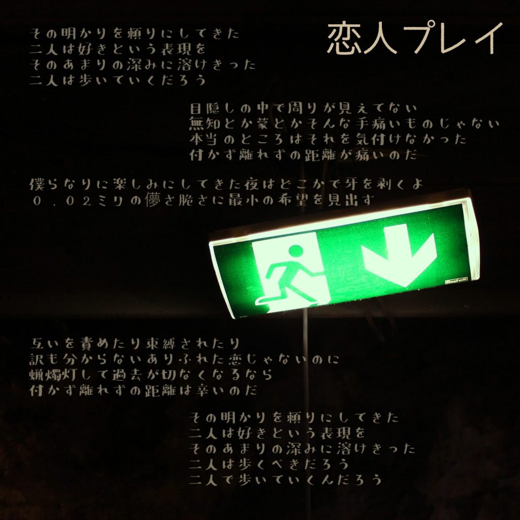 『恋人プレイ』というタイトルは、玉置勉強先生の作品からです。どこかの漫喫で読んだので残念ながら手元に持っているわけではありません。でも決して長い漫画モノではないのに、読んだ後の読了感が何故か尾を引いて、当時出来上がっていたメロディーに歌詞をつける際の参考にしました。ああいう邦画のような恋愛モノは、どうしようもなく大好きなのです。
